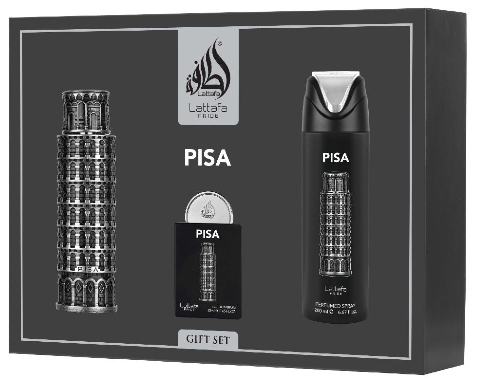 Crafted by the renowned house of Lattafa Pride, this exclusive gift set includes a 3.4 oz Eau de Parfum spray, a 6.7 oz perfumed body spray, and a 0.67 oz travel-size Eau de Parfum, making it a versatile choice for daily wear or special occasions. Whether you're gifting a loved one or treating yourself, Pisa offers a timeless scent journey that stands out with effortless charm.